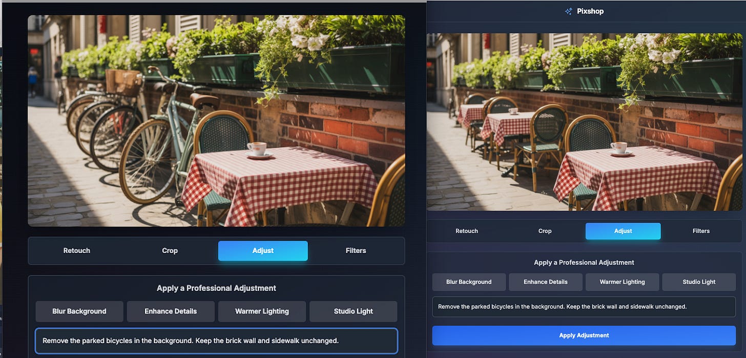 Object Removal: “Remove the parked bicycles in the background. Keep the brick wall and sidewalk unchanged.”