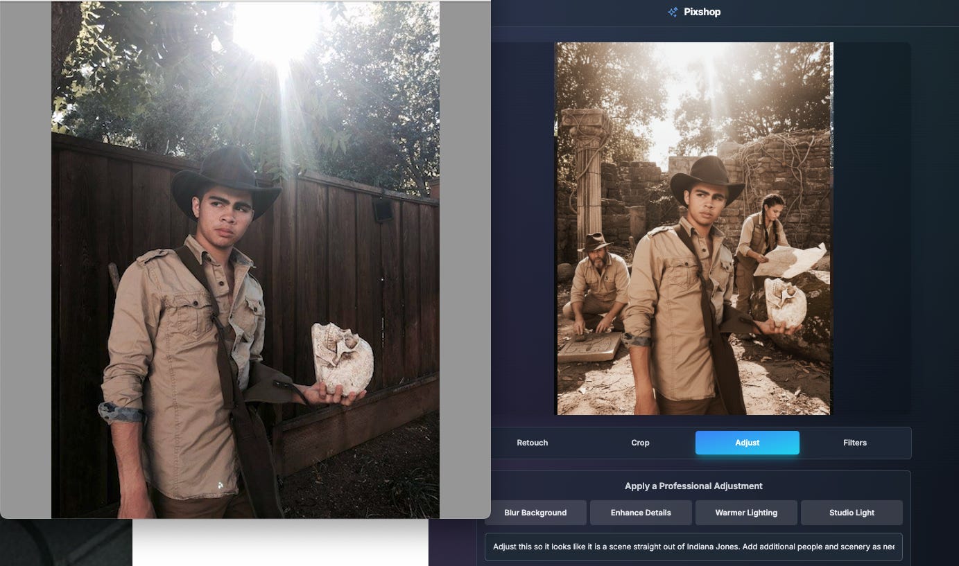 Prompt: “Adjust this so it looks like a scene straight out of Indiana Jones. Add additional people and scenery as needed.”