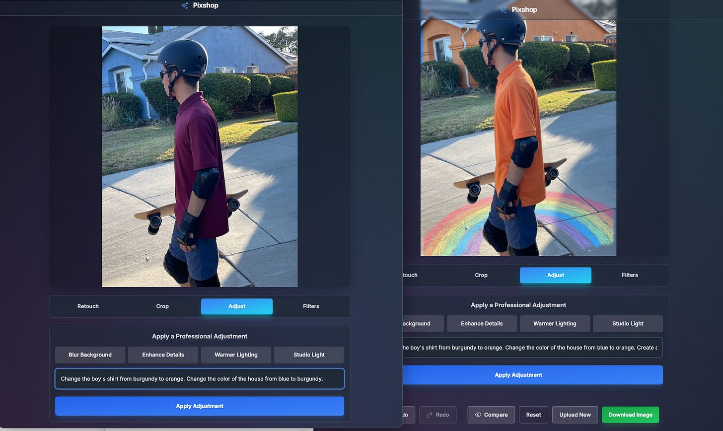 Prompt: “Make the boy’s shirt orange, the house orange. Add rainbow chalk drawing to driveway.”