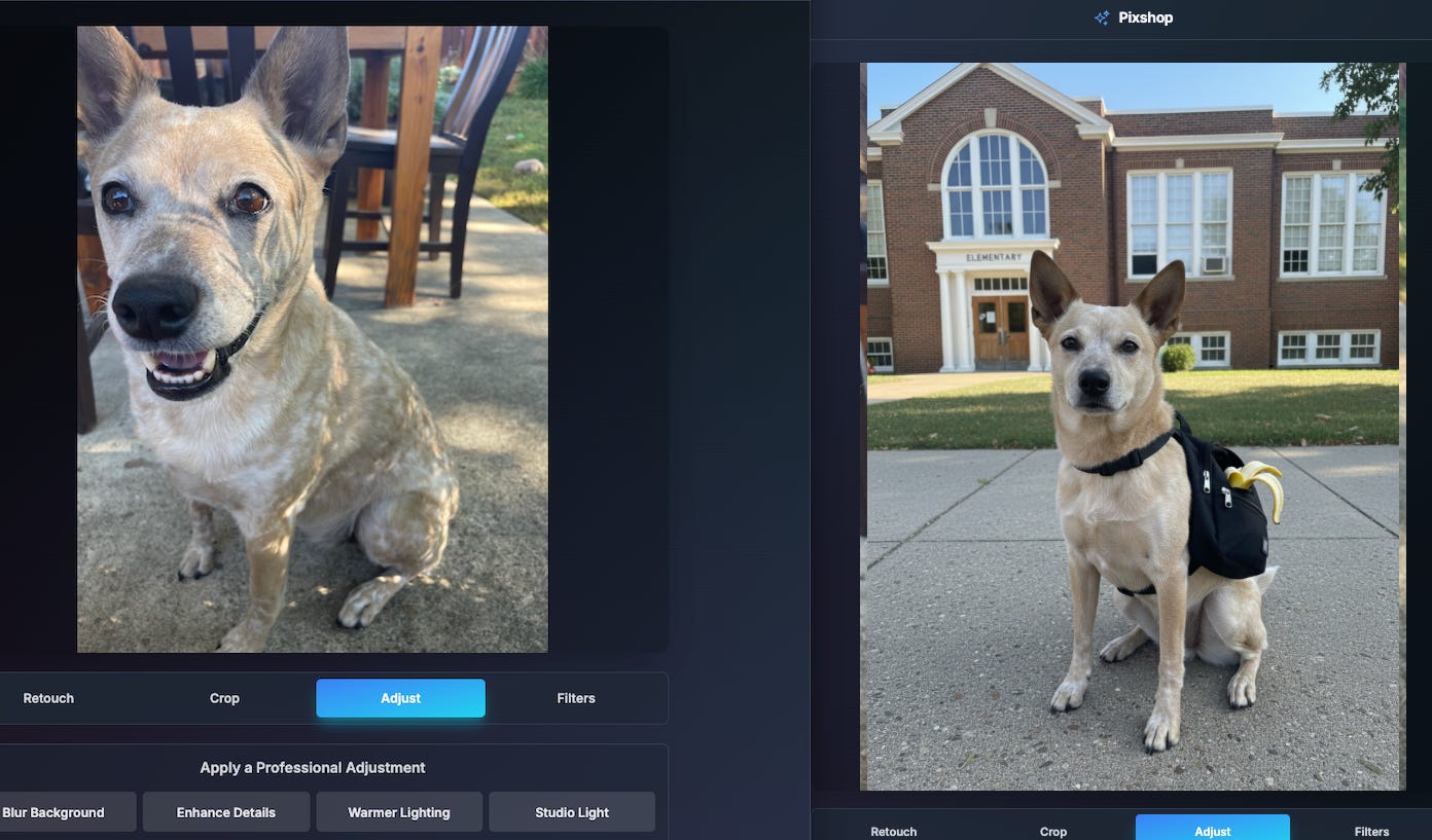 “Place the dog in front of a school building. Add a backpack with a banana sticking out.”