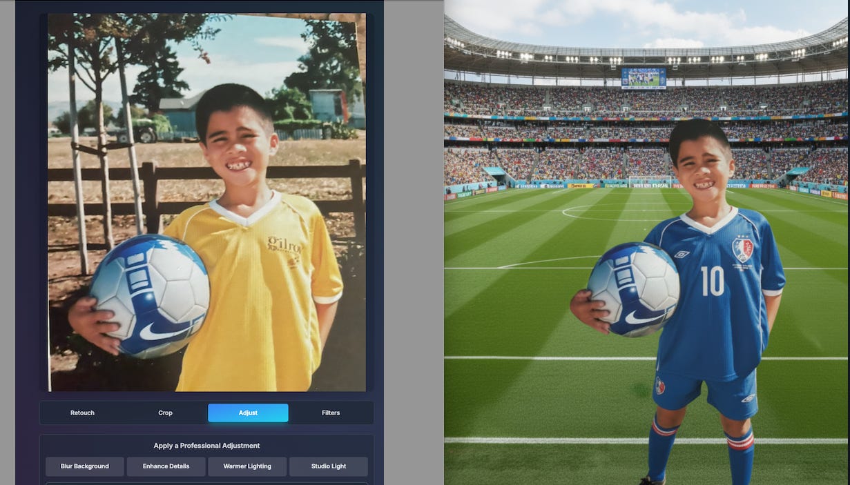 Background Replacement: “Change the background to the World Cup. Match lighting. Make child look like a member of the World Cup soccer team.”