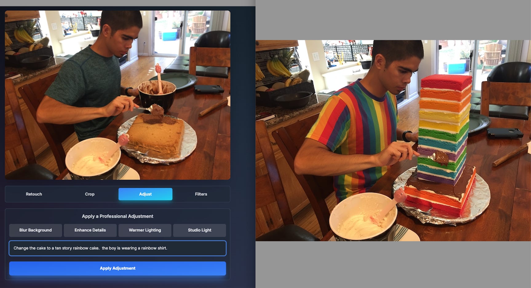 Prompt: “Change the cake to a ten-story rainbow cake, the boy is wearing a rainbow shirt.”